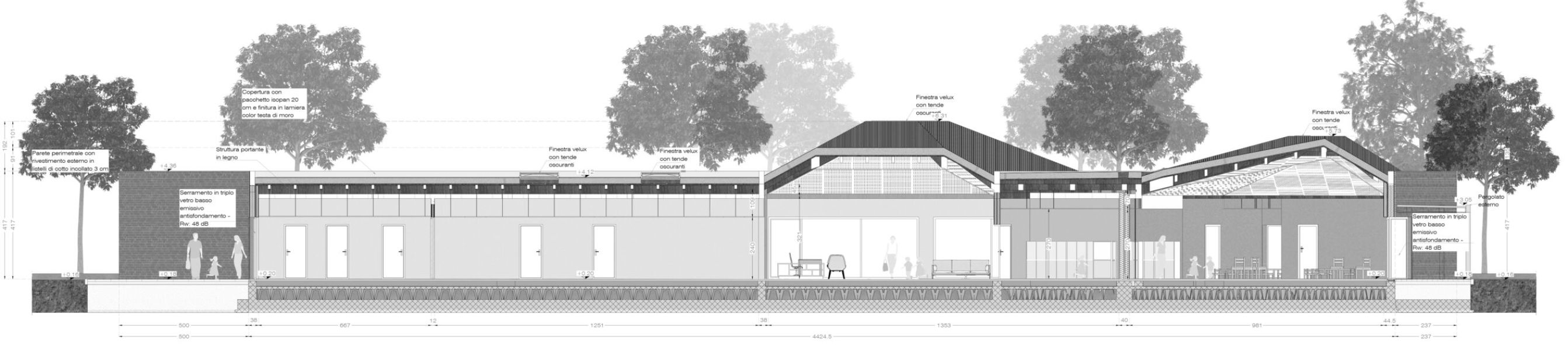 Il progetto prevede la demolizione e ricostruzione di un asilo nido a Vercelli, con l’obiettivo di ridefinire gli spazi dell’apprendimento attraverso un’architettura sostenibile e inclusiva. La nuova struttura, interamente in legno e a un solo livello, si caratterizza per ambienti aperti e luminosi, concepiti per favorire l’interazione e il benessere dei piccoli utenti. L’organizzazione interna privilegia la flessibilità, con aule integrate a spazi comuni che stimolano la socialità e l’esplorazione. L’esterno si configura come un’estensione naturale dell’insegnamento, con aree gioco e aule all’aperto che rafforzano il legame con l’ambiente. La copertura, con le sue inclinazioni variabili e volumi geometrici, dona un’identità dinamica alla struttura, filtrando la luce naturale in modo calibrato. L’impiego di sistemi prefabbricati e tecnologie avanzate garantisce massima efficienza energetica, portando l’edificio a standard nZEB. Il nuovo asilo si propone come un modello di sostenibilità e innovazione educativa, in grado di coniugare qualità architettonica e prestazioni ambientali.